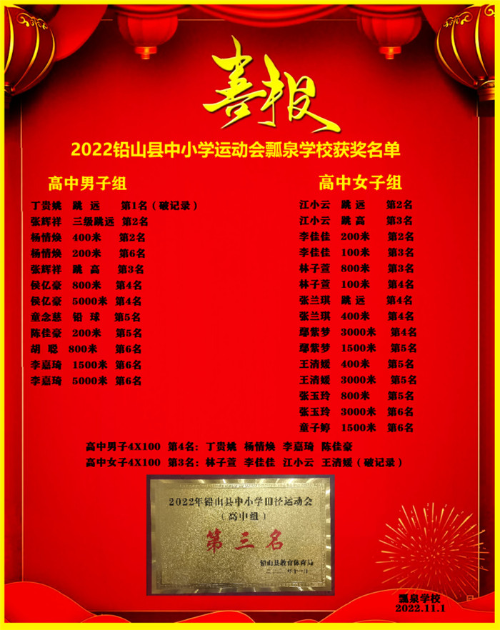 赛场上,我校运动员们顽强拼搏、团结合作,以团体总分106分荣获高中组第三名,为瓢泉学校取得了优异的成绩。