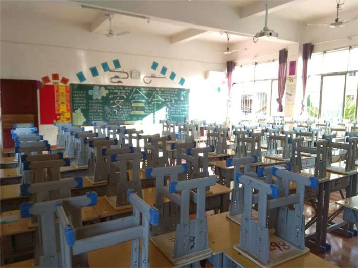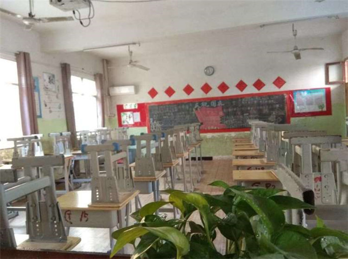 8、教室内桌椅及书本等物品摆放整齐,桌椅上无乱刻、乱贴现象,教室地面、墙壁、门窗、讲台、电风扇、日光灯等,室外走廊、墙面干净无灰尘、无污迹,无卫生死角。