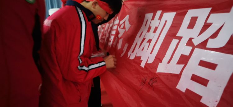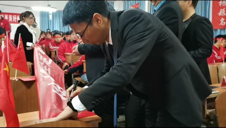 冲锋的号角已在耳边吹响,波澜壮阔的画卷已在眼前铺展。所有九年级的学子怀揣着庄严的承诺和美好的希望,带着成长的印记和师长的祝福,满载着担当和责任,大步迈向会场备战中考条幅前,坚定地写下他们的名字和目标。