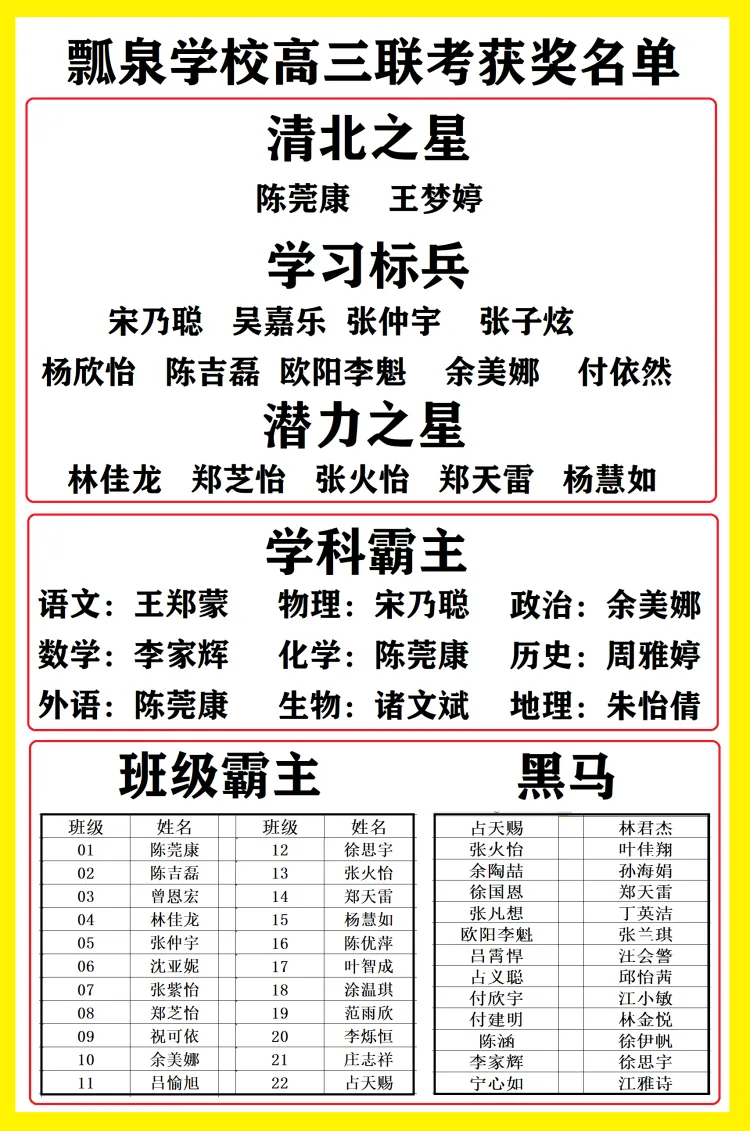 高三年级副主任范怀有宣读本次联考的表彰名单。大会表彰了清北之星2名、学习标兵9名、潜力之星5名、学科霸主9名、班级霸主22名和黑马26名。校领导分别为获奖学生颁奖。