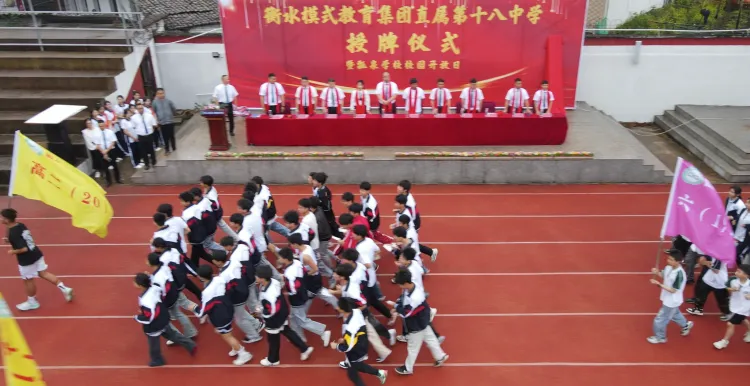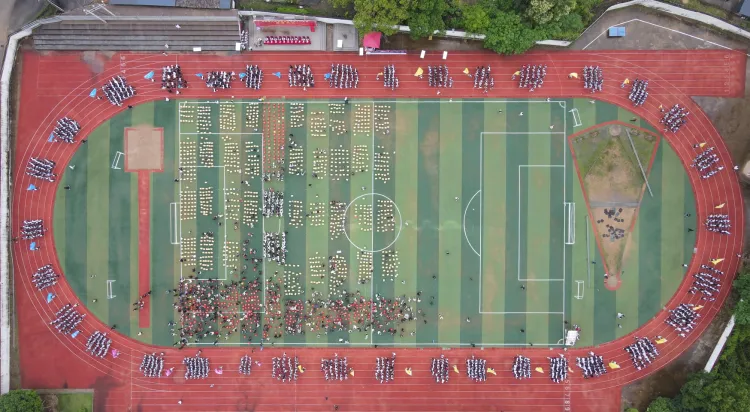 蔚蓝的天空中绽放着白云,红色的跑道上洋溢着热情,同学们跟着音乐摆动双臂,迈大步伐有节奏地前进。