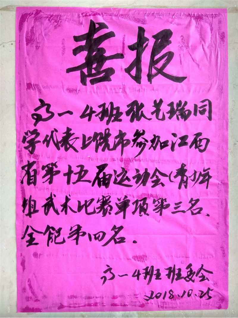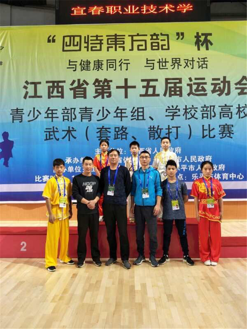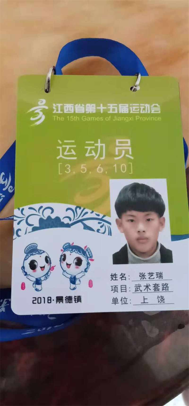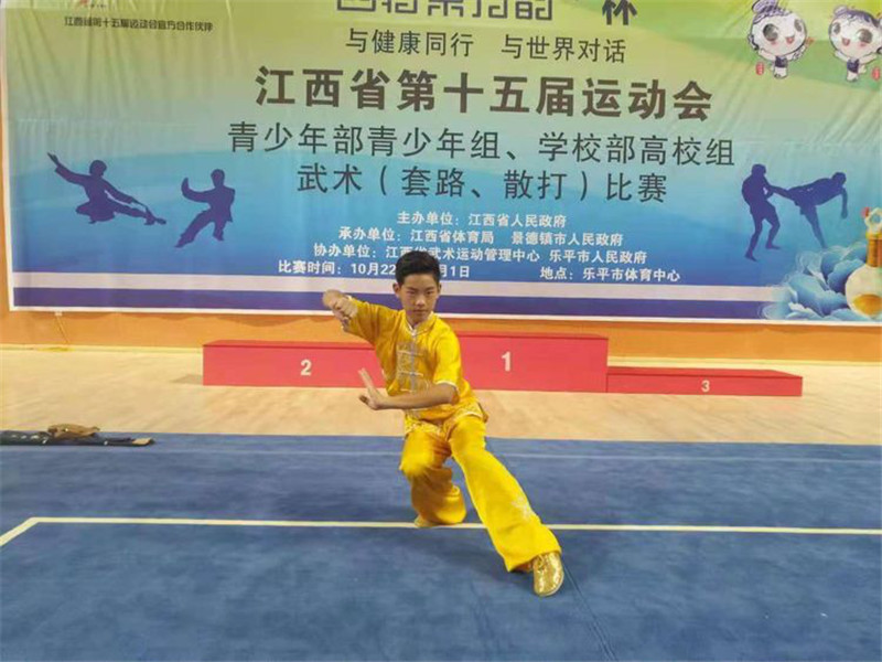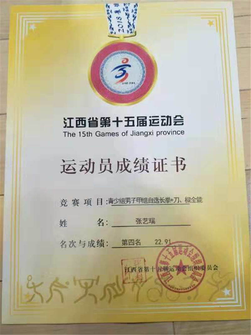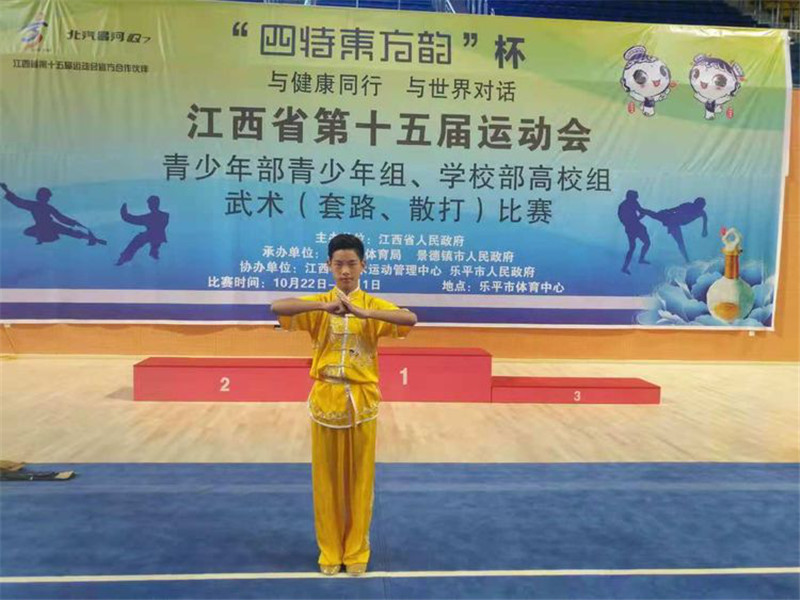 我校高一(4)班张艺瑞同学代表上饶市参加江西省第十五届运动会青少年组武术比赛荣获单项第三名,全能第四名。在此,向他表示祝贺!