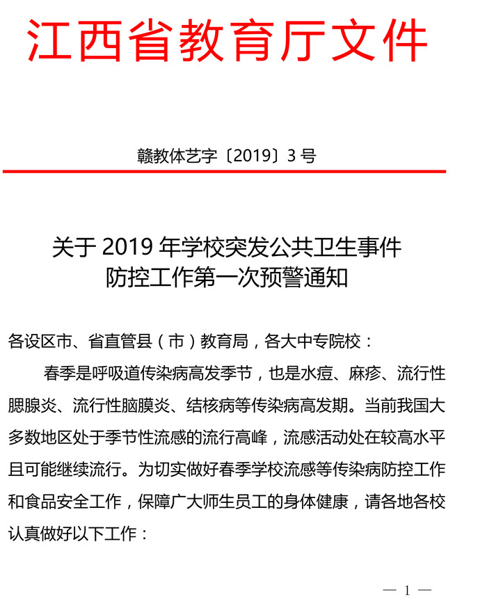 首页 > 校园公告 > 关于2019年学校突发公共卫生事件防控工作第一次预警的通知